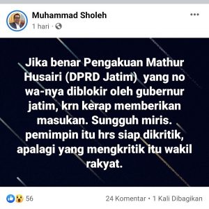 “Pengakuan Mathur Husyairi (DPRD Jatim) yang nomor whatsappnya diblokir Gubernur Jatim, karena kerap memberikan masukan,” begitu kutipan status Sholeh.